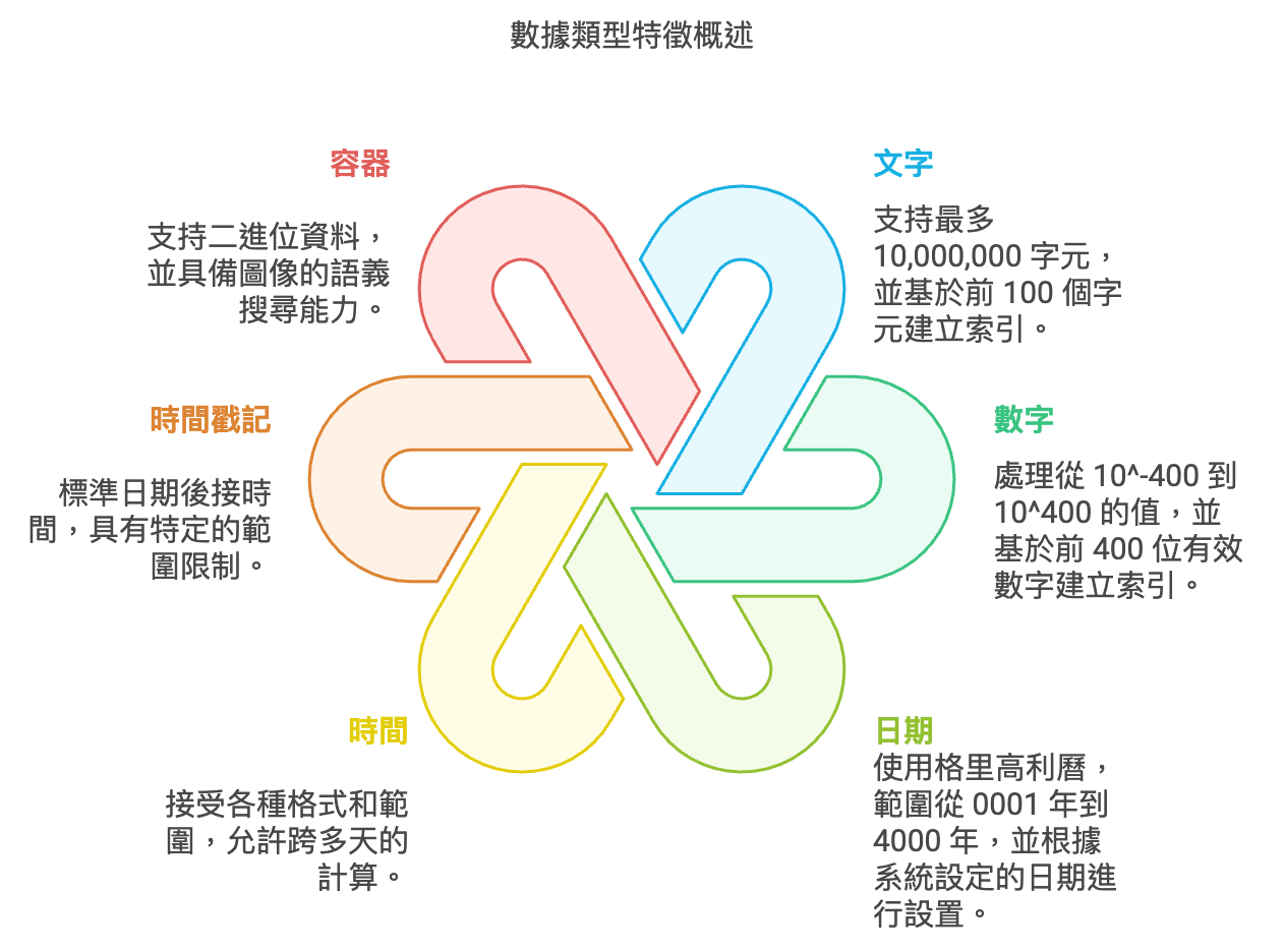 文字(Text):每個欄位每個重複最多可達 10,000,000 字元(受可用記憶體限制),並可選擇加入文字樣式執行和段落執行。索引基於每個單詞或值的前 100 個字元。