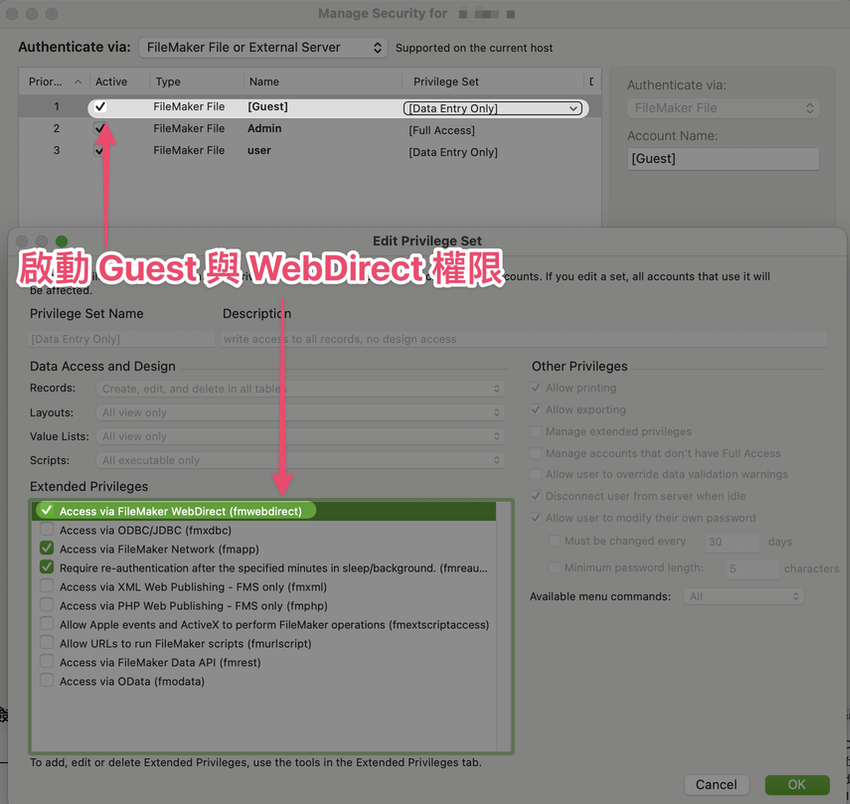 3. 啟動 "Guest" 帳號並設定 Guest 權限集可以存取 FileMaaker WebDirect (下圖所示)