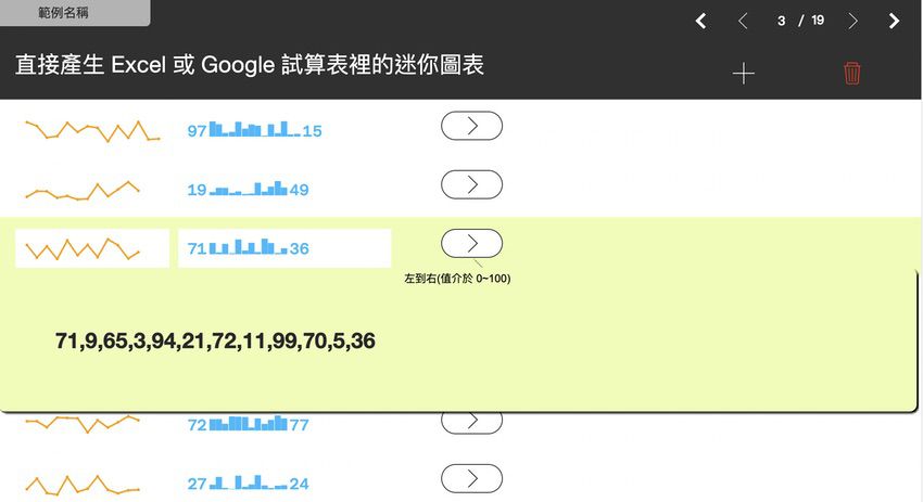 在 Excel或 Google 的試算表中插入迷你圖是很常見,但是試算表使用彈性當然不如"資料庫"的使用強大與彈性,在 FileMaker 完成這件事是非常容易,您也可以在這樣的資料列表方式去快速看迷你圖的背後,點撃看數值內容問題,甚至是再延申產生不同的條狀圖,或趨勢走向圖,或接著搜尋相關資料等來應用。
