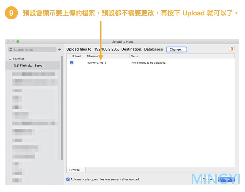 請注意,您如果要上傳到 FileMaker Server,自然要先有安裝好 FileMaker Server,請參考。