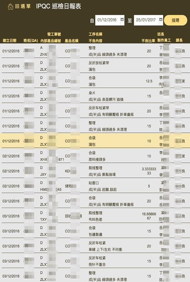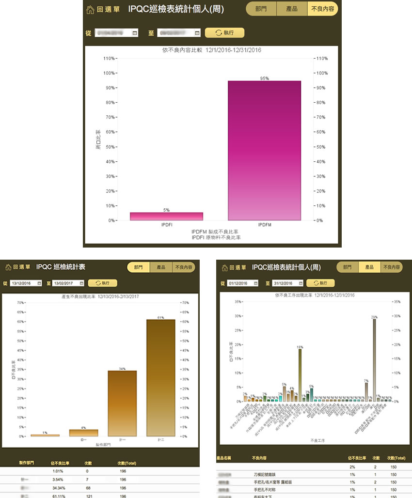 巡檢表可按照日期區間,依部門、產品、不良內容等做圖表與列表顯示,同時顯示日報表。